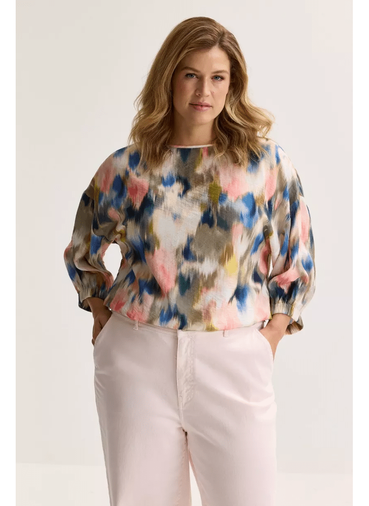 Een blouse om je vrij in te voelen! Pasteltinten die je huid laten stralen, een soepele stof die met je meebeweegt en details die je silhouet subtiel vormgeven: lage mouwen met elastiek, een nonchalante ronde hals en een tailleband die alles elegant samenbrengt.