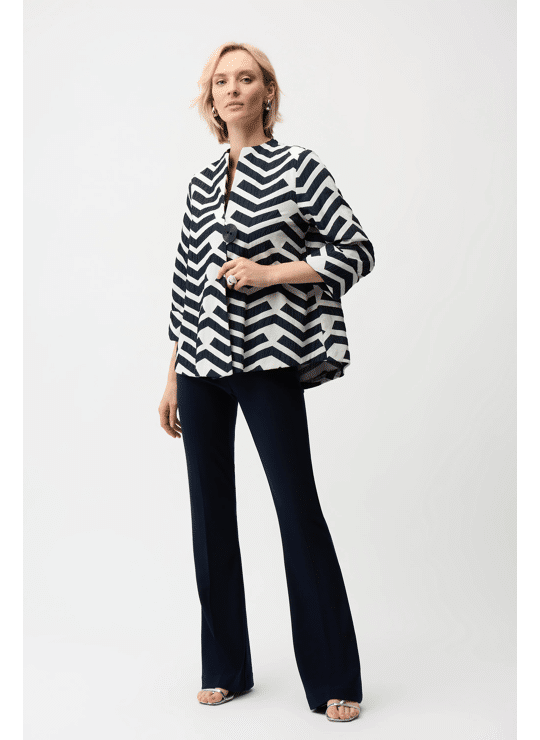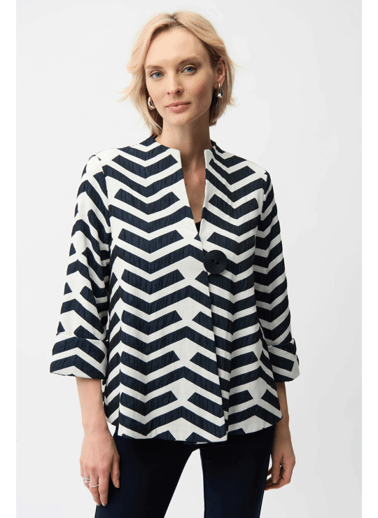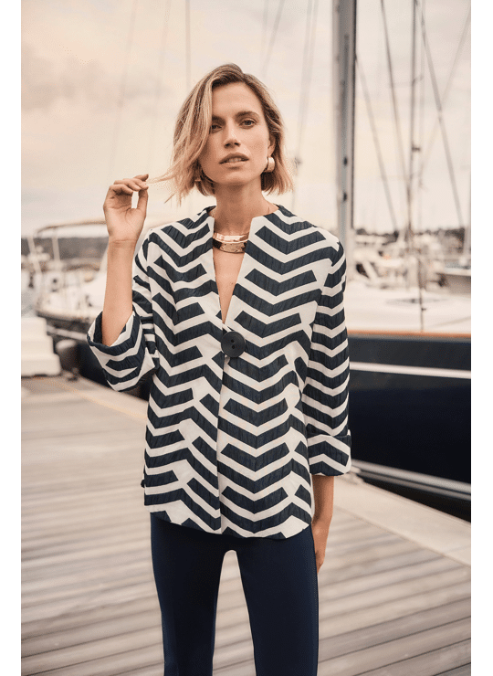 Deze jacquardjas straalt textuur en karakter uit en is voorzien van een opvallend geometrisch patroon, een strakke ronde hals, driekwartmouwen en opvallende knopen voor een moderne afwerking.