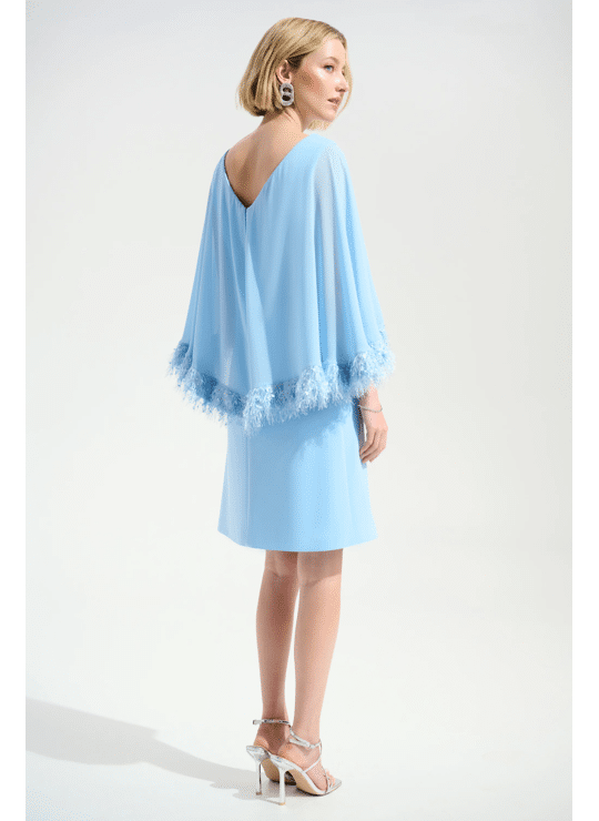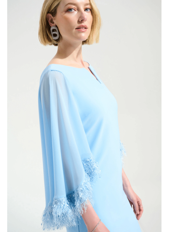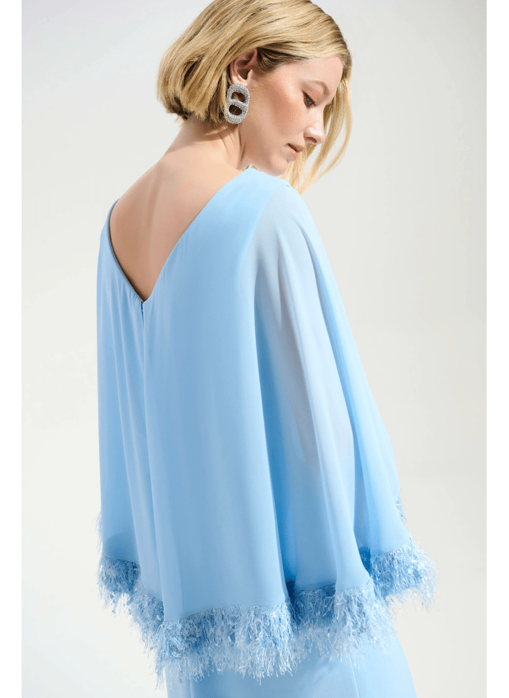 Deze A-lijn jurk heeft een zachte split bij de halslijn en een doorschijnende chiffon cape afgezet met delicate, originele bandjes.