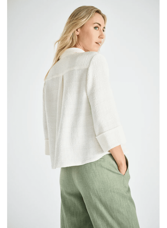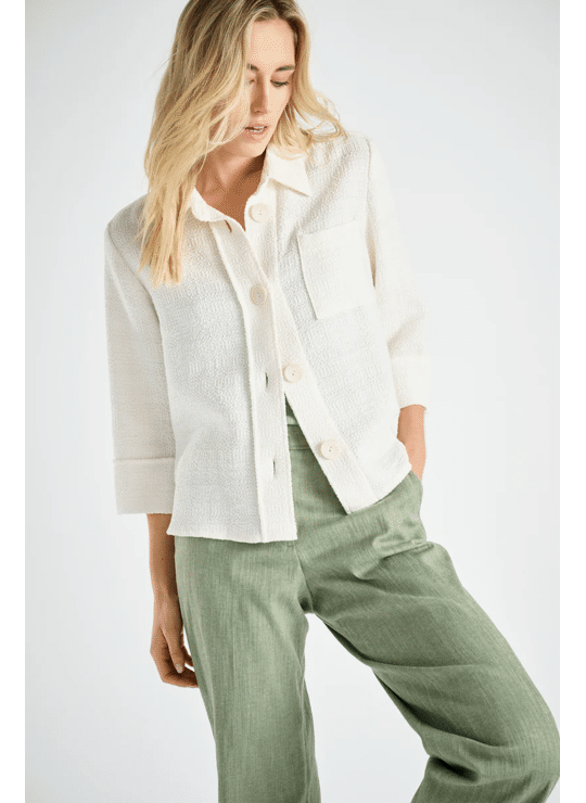 Chique crème bloesjas met stijlvolle structuur in de stof.Vooraan geknoopt, hemdskraag, borstzak.