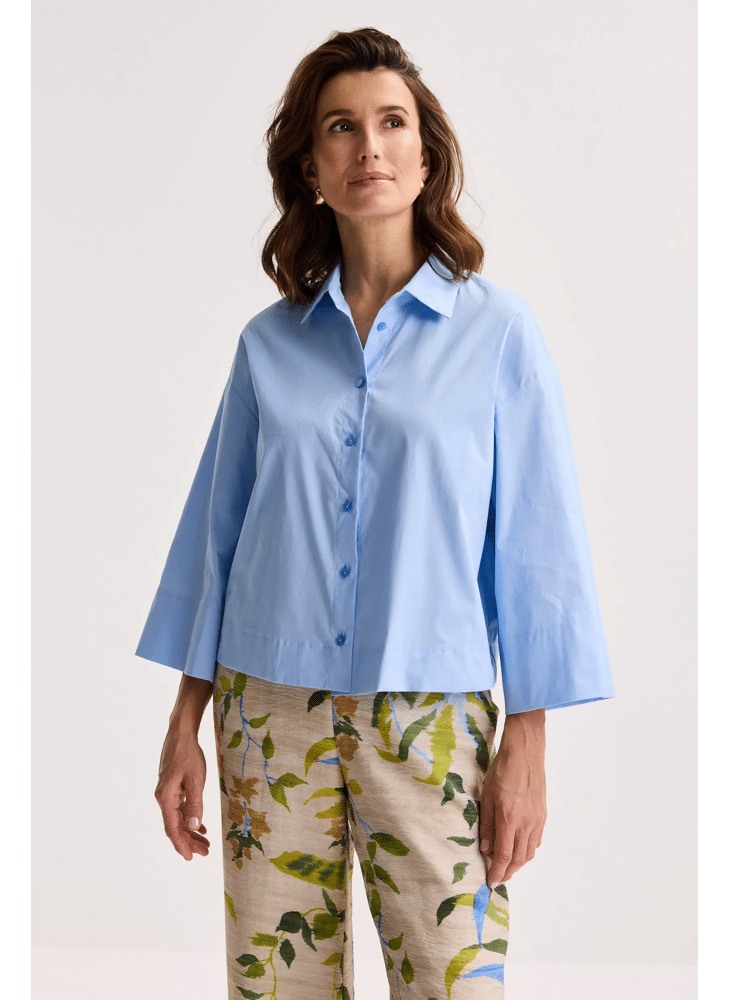 Een frisse basic met karakter: dit korte boxy hemd in crispy popeline, met aangefronste rug en brede 3/4‑mouw, tilt elke look op. Draag het nonchalant of strak chic, met omgeslagen mouwen of als licht jasje. Een veelzijdige essential die je garderobe jarenlang charme geeft.
