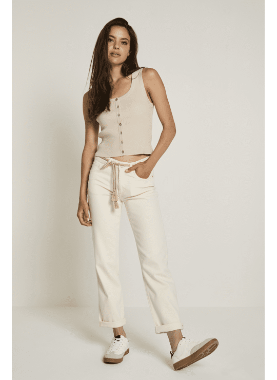 Bobby is een stoere broek met een hoge taille met een losser vallende pasvorm over het hele been. Dankzij de omgeslagen broekspijp staan je sneakers of boots extra leuk onder dit model. Het gevlochten koord is een echte eyecatcher en geeft het een casual look in combinatie met de broek.